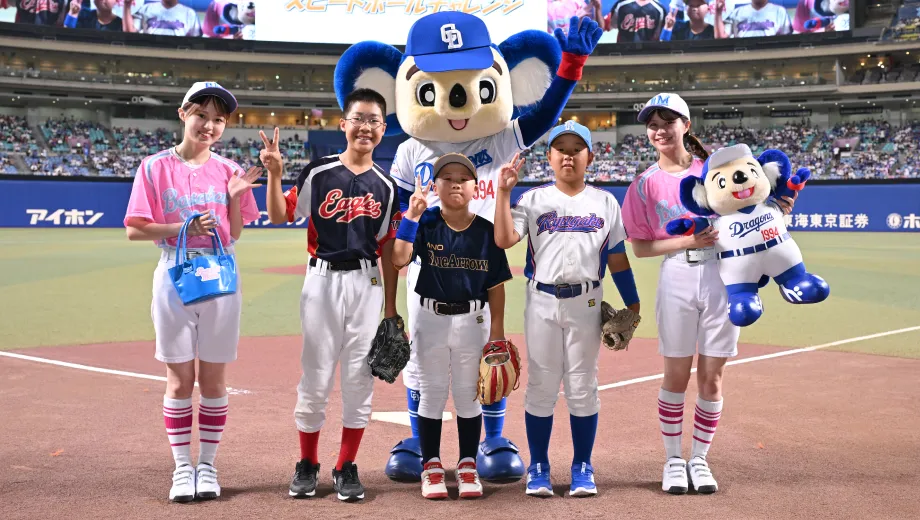 試合前に開催された「始球式」「スピードボールチャレンジ」には、東海ろうきんが主催・協賛する少年野球大会に出場している小学生の中から抽選で選ばれた球児が参加しました。