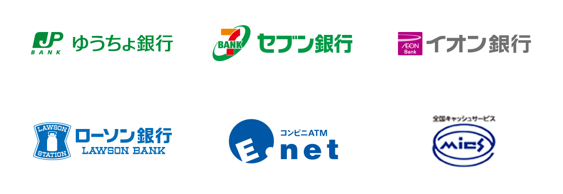 東海ろうきんのキャッシュカードなら、全国の〈ろうきん〉ATMはもちろん、MICSマークのある銀行・信用金庫などの金融機関やゆうちょ銀行、セブン銀行、イオン銀行、コンビニなどのATMで利用可能です。