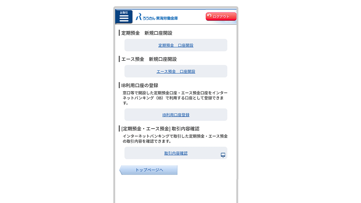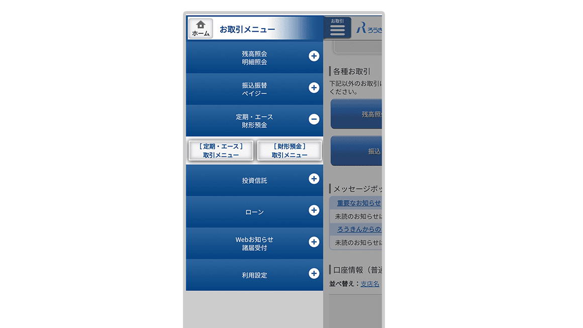ろうきんダイレクトログイン後、お取引メニューから【〔定期・エース〕取引メニュー】を選択してください。