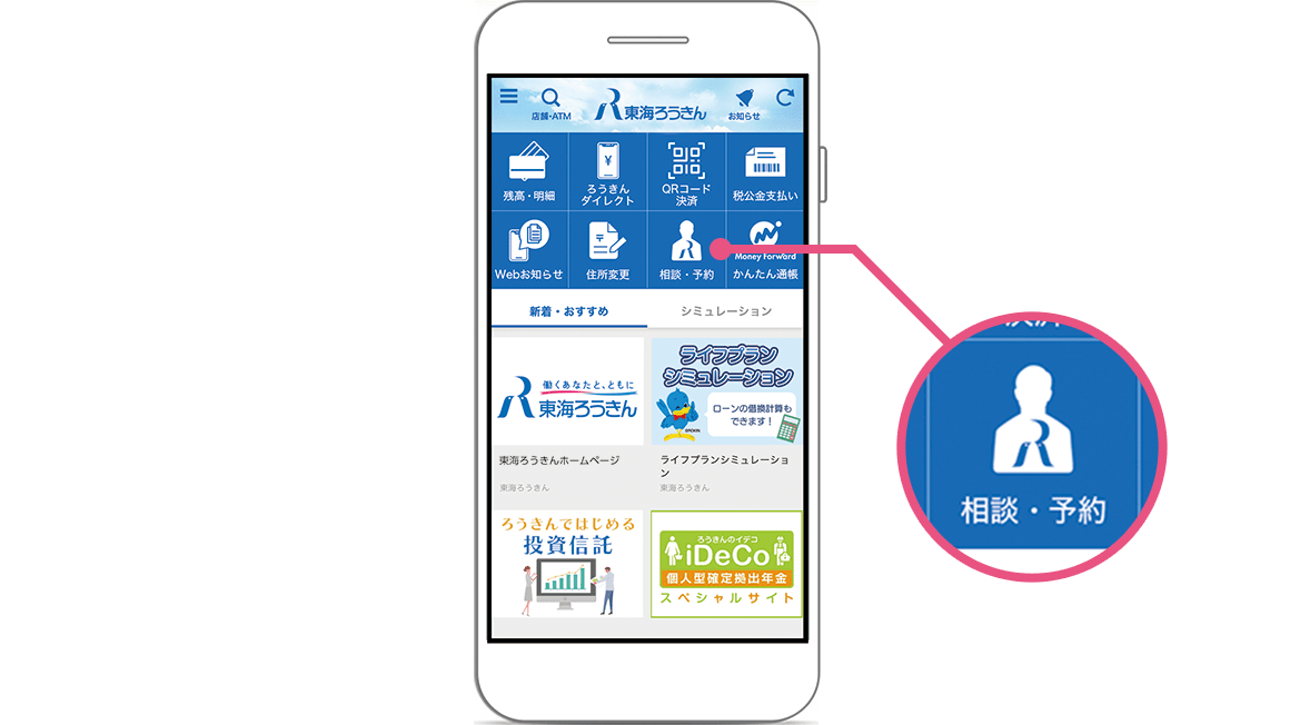 ろうきんに相談したいとき、「ろうきんアプリ」からご希望の店舗に来店の予約ができます。