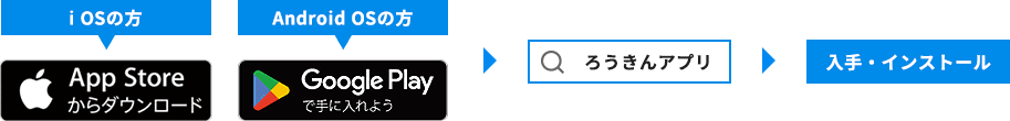 まずは、「App Store」、または「Google Play」で「ろうきんアプリ」と検索していただき、「ろうきんアプリ」をダウンロードしてください。