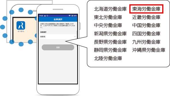 「ろうきんアプリ」を起動すると、金庫選択画面が表示されますので、「東海労働金庫」を選択して「登録」ボタンを押してください。