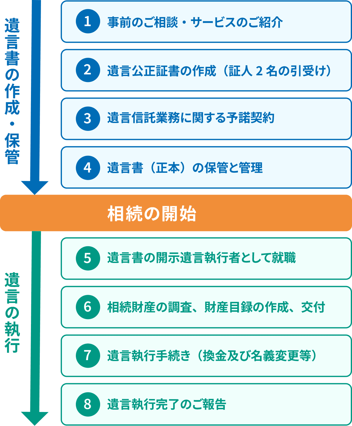 提携信託会社が遺言者のご意思、目的に沿った遺言書作成のアドバイスをし、遺言書の保管を行い、遺言者の死亡後、遺言執行者として遺言の内容を実現するまでのお手伝いをさせていただくサービスです。