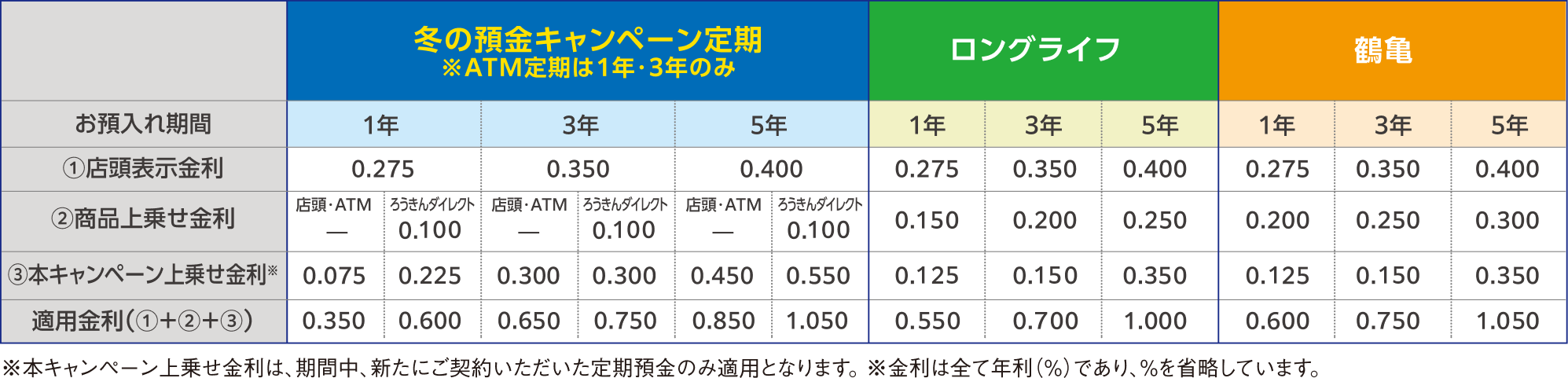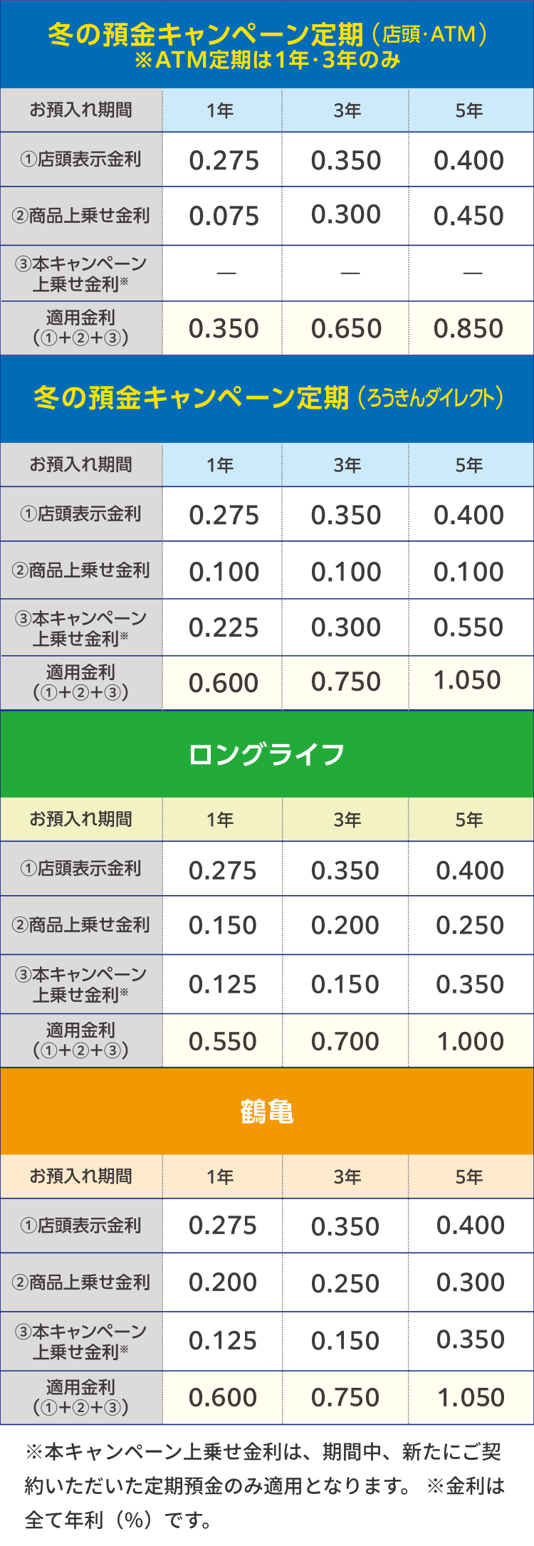いただきたい事柄1.下記商品の金利は、初回お預入れの満期日まで適用されます。
