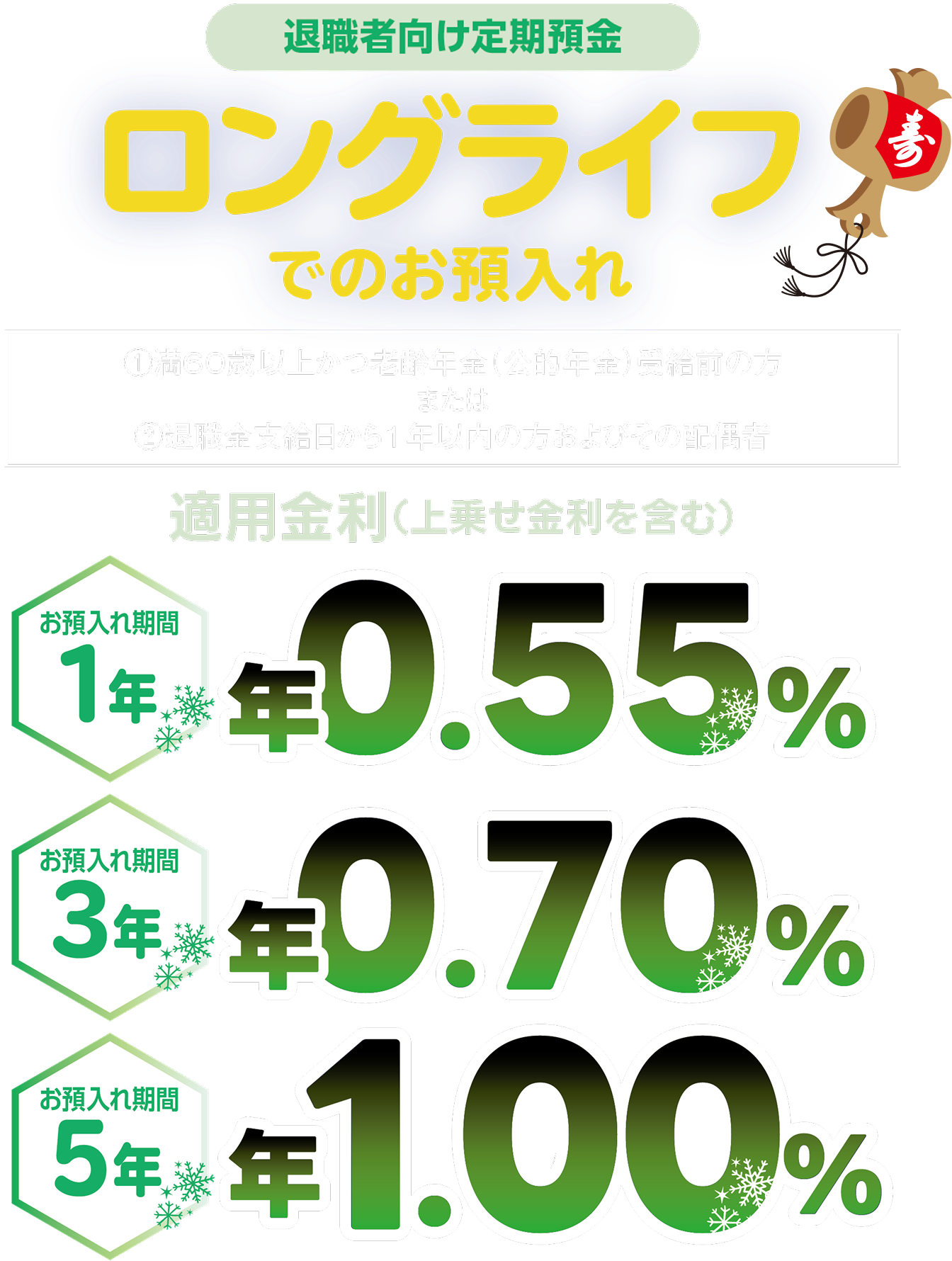 いただきたい事柄1.本商品の金利は、初回のお預入れ満期日まで適用されます。満期経過後は、満期経過時点のスーパー定期または大口定期のお預入れ期間毎の店頭表示金利が適用されます。なお、ろうきんダイレクトでのお預入れは満期経過時点の「商品上乗せ金利」と「冬の預金キャンペーン上乗せ金利(キャンペーン実施中の場合)」を加えた金利が適用されます。