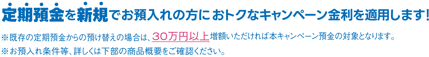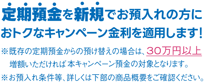 ※既存の定期預金からの預け替えの場合は、30万円以上増額いただければ本キャンペーン預金の対象となります。