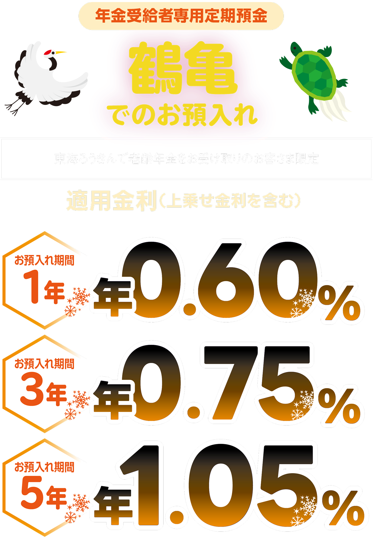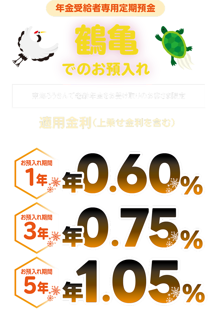 4.「鶴亀」について、自動継続時に「ご利用いただける方」の条件を満たさない場合、「鶴亀」としてのお取扱いは終了し、上乗せ金利は適用されません。