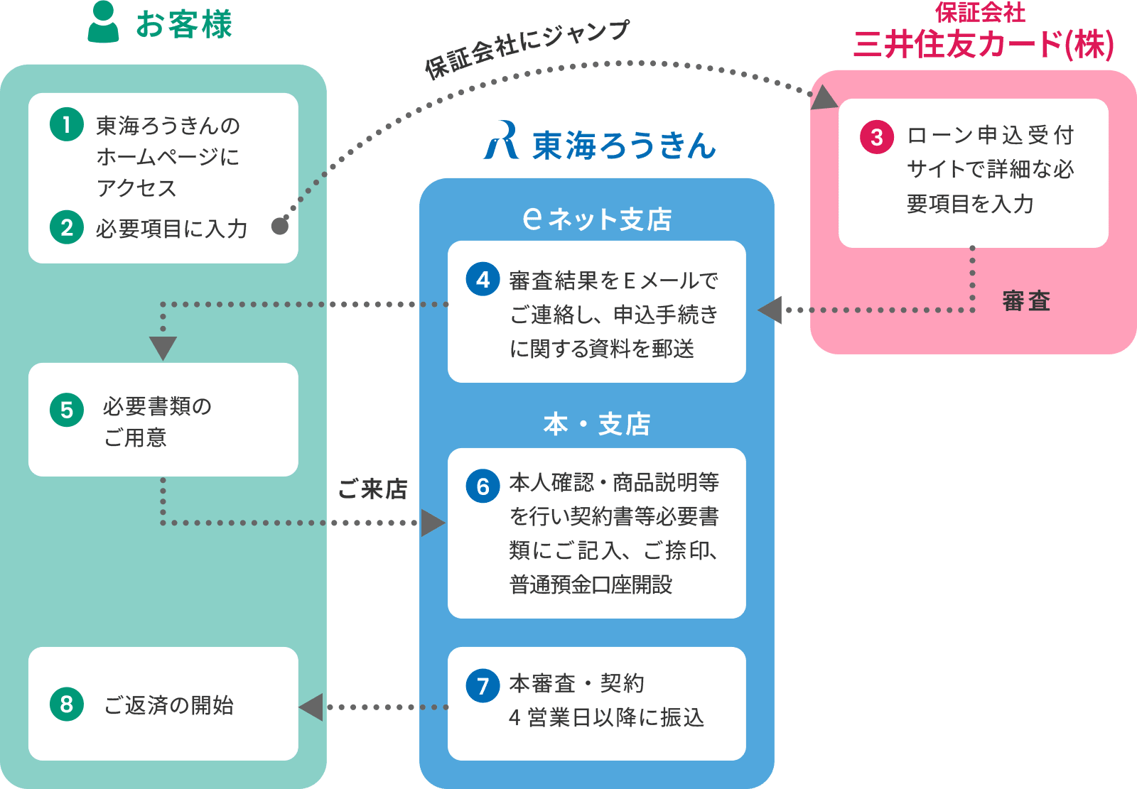 東海ろうきんの本・支店に本人確認のための書類やお見積書等の必要書類をお持ちいただきご来店いただきます。契約書に署名・捺印をいただき、振込先の指定 をしていただきます。東海ろうきんの総合口座(普通預金口座)をお持ちでない方は、この場で口座を開設していただきます。